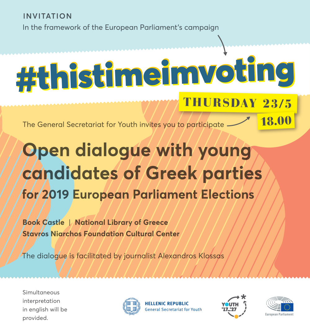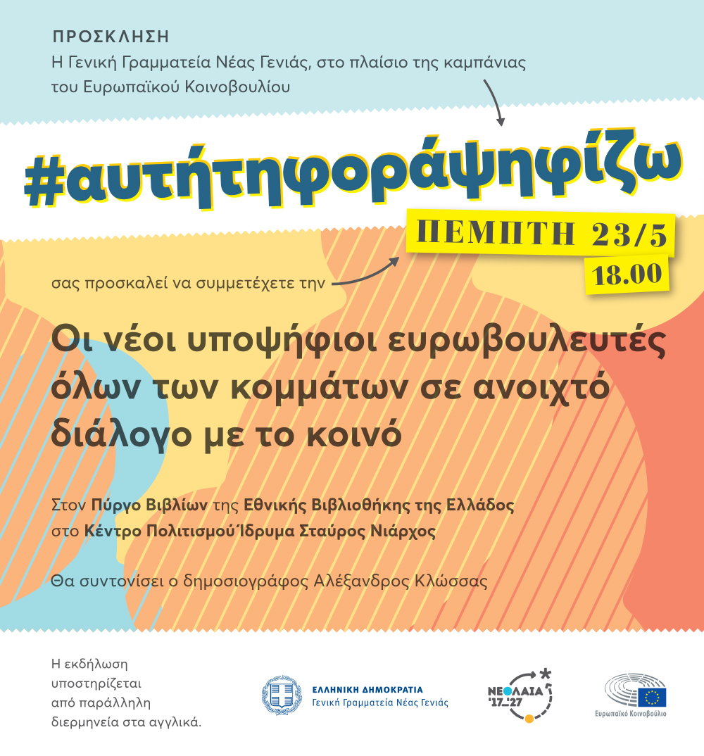 H Γενική Γραμματεία Νέας Γενιάς διοργανώνει την Πέμπτη 23/5/2019, στις 18:00, στον Πύργο Βιβλίων της Εθνικής Βιβλιοθήκης της Ελλάδος, στο Κέντρο Πολιτισμού Ίδρυμα Σταύρος Νιάρχος, εκδήλωση στο πλαίσιο της καμπάνιας Ευρωπαϊκού Κοινοβουλίου #αυτήτηφοράψηφίζω.