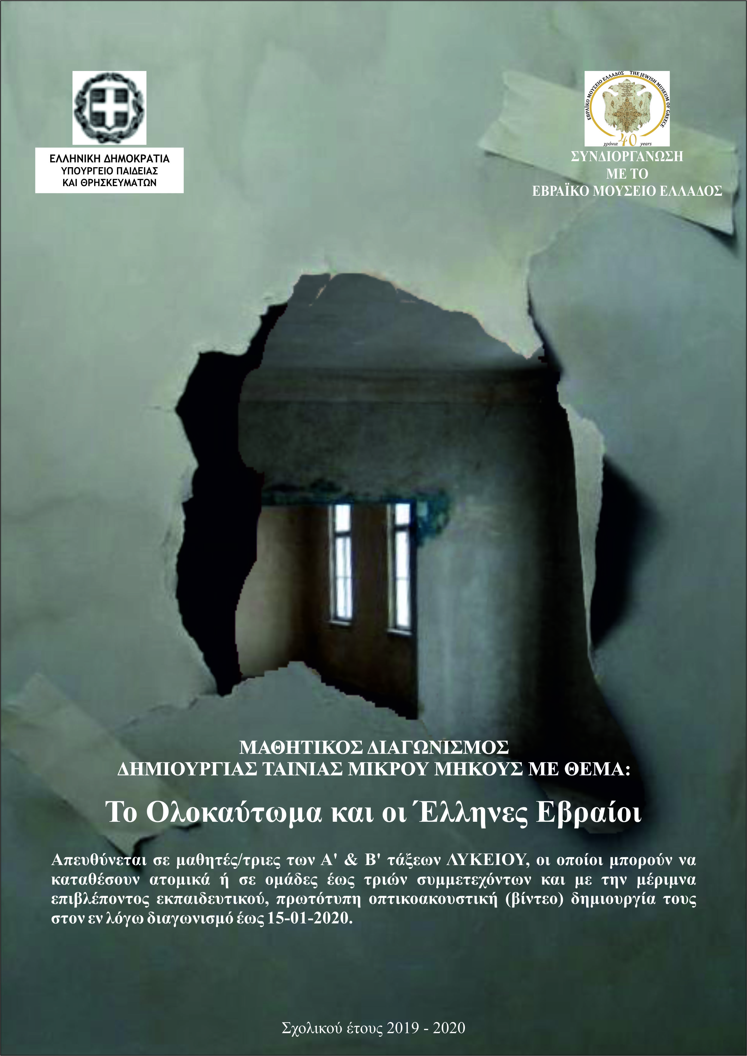 Η Γενική Γραμματεία Θρησκευμάτων του Υπουργείου Παιδείας, Έρευνας και Θρησκευμάτων και το Εβραϊκό Μουσείο Ελλάδος διοργανώνουν Μαθητικό Διαγωνισμό Δημιουργίας Ταινίας Μικρού Μήκους (βίντεο) με θέμα: «Το Ολοκαύτωμα και οι Έλληνες Εβραίοι».
