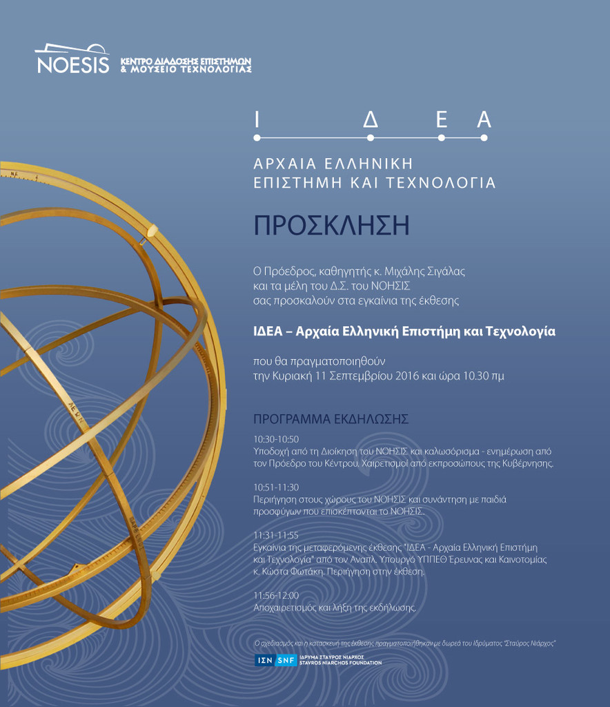 Την Κυριακή 11/9/2016 και ώρα 10:30 π.μ. στο Κέντρο Διάδοσης Επιστημών και Μουσείο Τεχνολογίας ΝΟΗΣΙΣ θα πραγματοποιηθεί εκδήλωση για τα εγκαίνια και την πρώτη παρουσίαση της μεταφερόμενης έκθεσης «ΙΔΕΑ – Αρχαία Ελληνική Επιστήμη και Τεχνολογία».