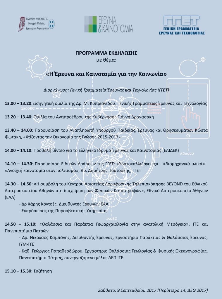 Το Σάββατο 9 Σεπτεμβρίου διοργανώνουν η Γενική Γραμματεία Έρευνας και Τεχνολογίας και ο Τομέας Έρευνας και Καινοτομίας, Ανοιχτή Εκδήλωση με τίτλο: «Η Έρευνα και Καινοτομία για την Κοινωνία», στον κεντρικό χώρο εκδηλώσεων του Περιπτέρου 14, ώρα 13:00 – 15:30.