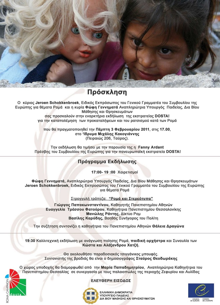 Για την πρόσκληση στην Εκδήλωση εκστρατείας DOSTA για την καταπολέμηση των προκαταλήψεων και του Ρατσισμού των Ρομά πατήστε εδώ.