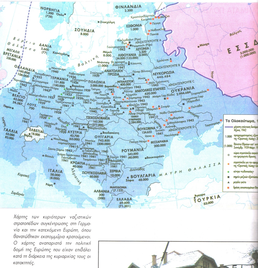 Ο χάρτης στη σελίδα 130 του βιβλίου της Ιστορίας- που διδάσκεται από το 2007 με έγκριση του Παιδαγωγικού Ινστιτούτου- απεικονίζει τα κυριότερα ναζιστικά στρατόπεδα συγκέντρωσης στη Γερμανία και την κατεχόμενη Ευρώπη κατά τη διάρκεια του Β’ παγκοσμίου πολέμου.
